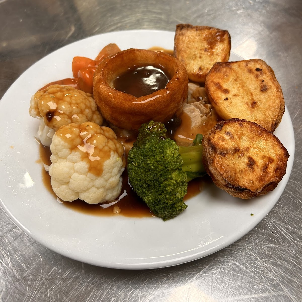 Roast pork roast potatoes selection of fresh vegetables Yorkshire pudding followed by jam sponge & custard £8.50